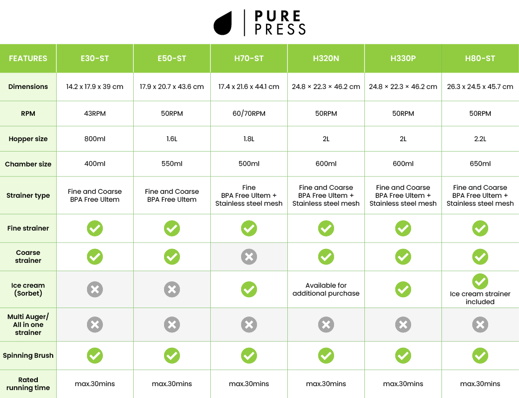 The Hurom Pure Press Lineup produces exceptionally low-pulp juice using Hurom's patented strainer technology, ensuring a smooth and nutrient-dense beverage in every glass.