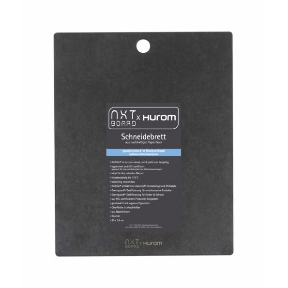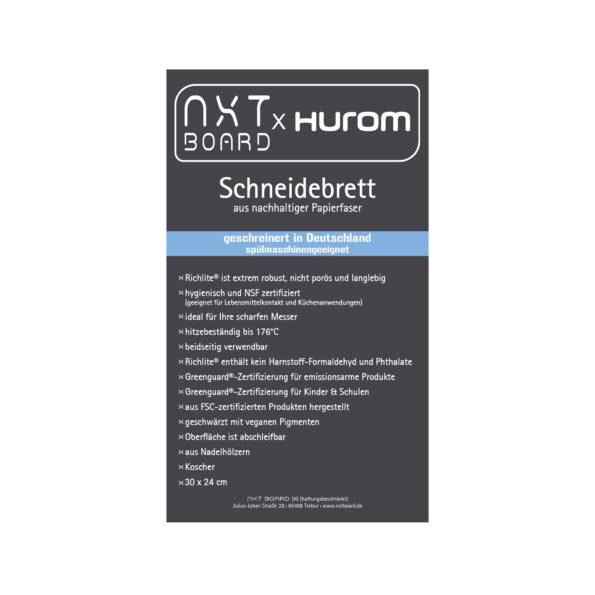 Naše visokokvalitetne daske za rezanje se proizvode u Njemačkoj. Izrađuju se u stolariji u Njemačkoj od papirnog kompozitnog materijala pod nazivom Richlite®. Osnovu ovog materijala čini meko drvo koje je vrlo robusno i izdržljivo, ali i vrlo lagano. Richlite® nije porozan i stoga je savršen za oštre noževe. Naša crna daska za rezanje NXT Board, izrađena od Richlitea, nema utore za sok i može se koristiti s obje strane.